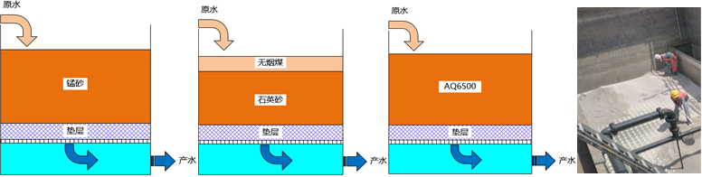 | 對比內容 | AQ6500快速濾池過濾工藝 | 錳砂快速濾池過濾工藝 | ||